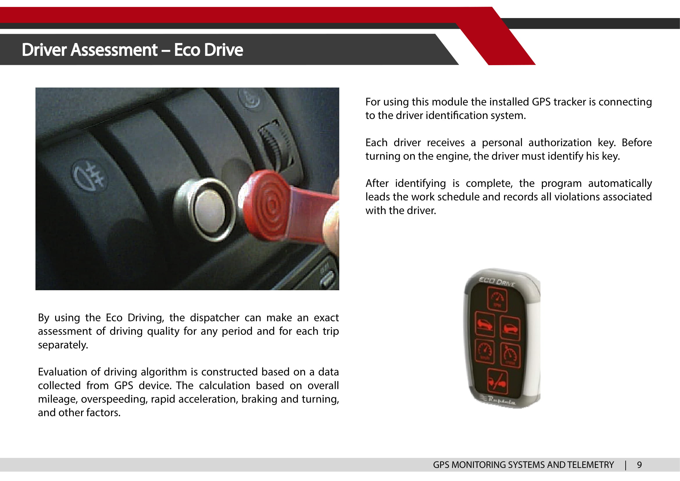 A telematics unit - a GPS tracker, is installed in the car. The device transmits real-time information to the dispatch center about the location, speed, fuel consumption, and state of the sensors (e.g. the engine is started, the door is opened.)